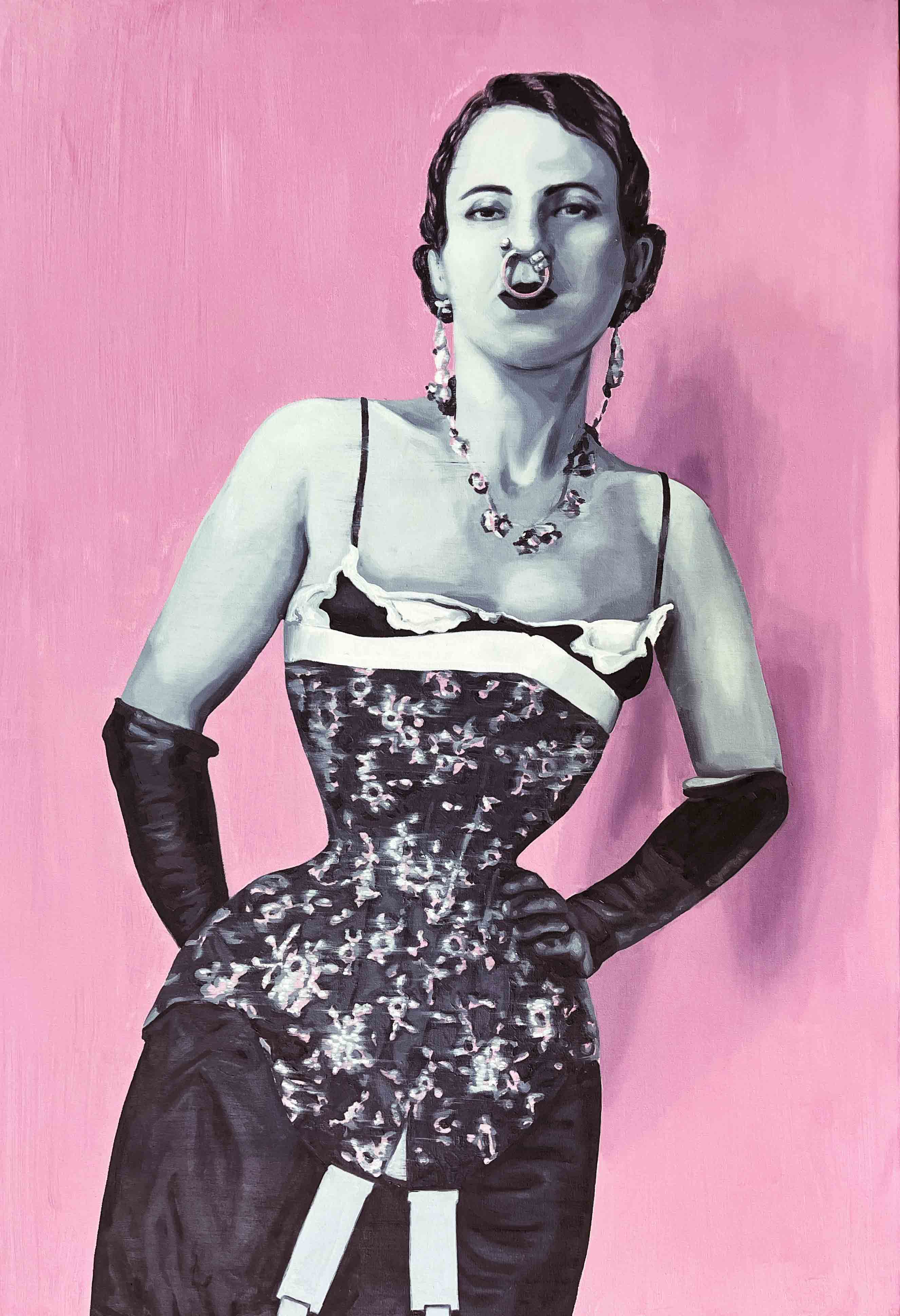 “Como es habitual en mi trabajo, cada pintura de este proyecto nace de una fotografía encontrada. En esta ocasión, comencé seleccionando algunas entre las muchas que voy guardando en carpetas en el ordenador porque suscitan mi interés. Al ir seleccionando y descartando comenzó a perfilarse el tema común de la máscara y el disfraz, de la personalidad performada conscientemente. La idea de “La feminidad como máscara”, que formuló Joan Riviere en 1929 en un artículo del mismo nombre, se me aparecía como un concepto a explorar. Al fin y al cabo, la feminidad y la masculinidad son también máscaras que adoptamos para presentarnos ante los demás.